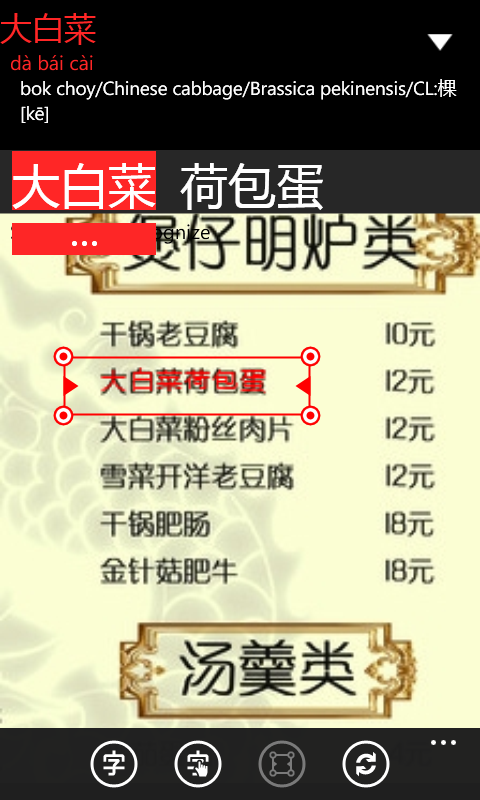 Almare Chinese Reader for Windows Phone version 1.1. You can buy the application from the Windows Marketplace or download a free trial. In the trial you can browse the dictionary and test the character recognition ability. Getting translations for automatically recognized characters requires purchase of the full version.