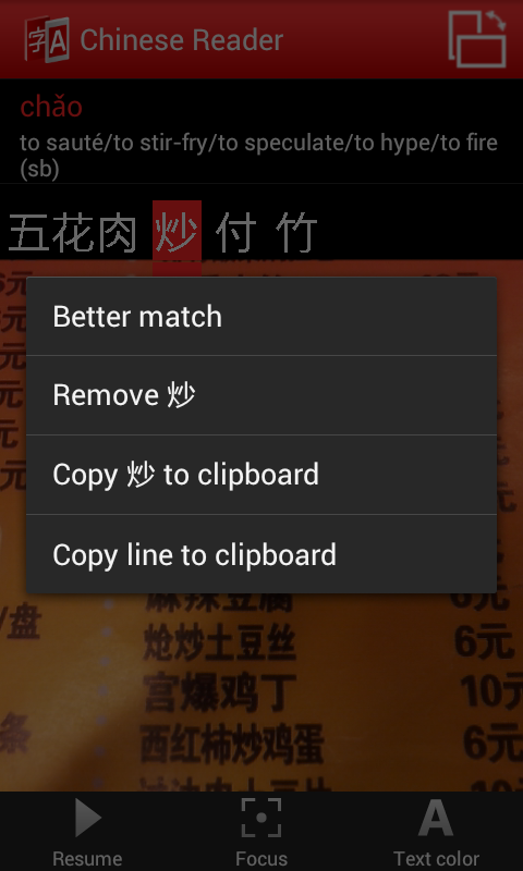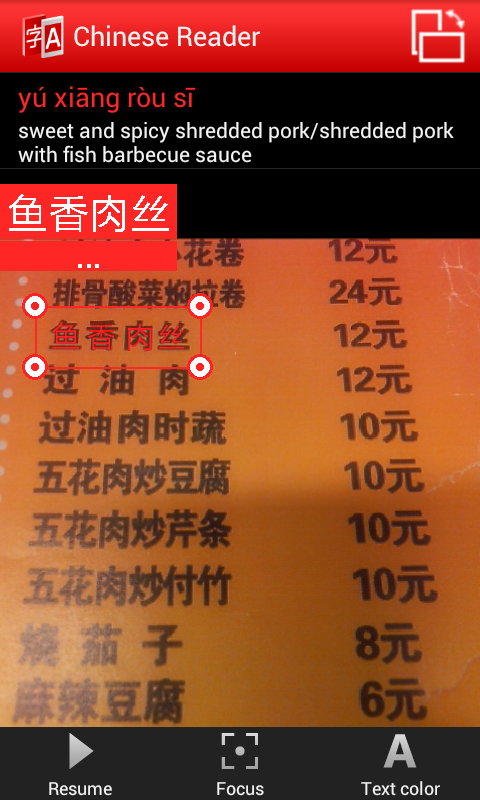 Application uses optical character recognition (OCR) to recognize Chinese characters from a live camera feed or a still photo. Point the camera to the Chinese text and adjust the recognition window to a line of Chinese text. You can pause the camera to view the characters or capture the image to study the text.