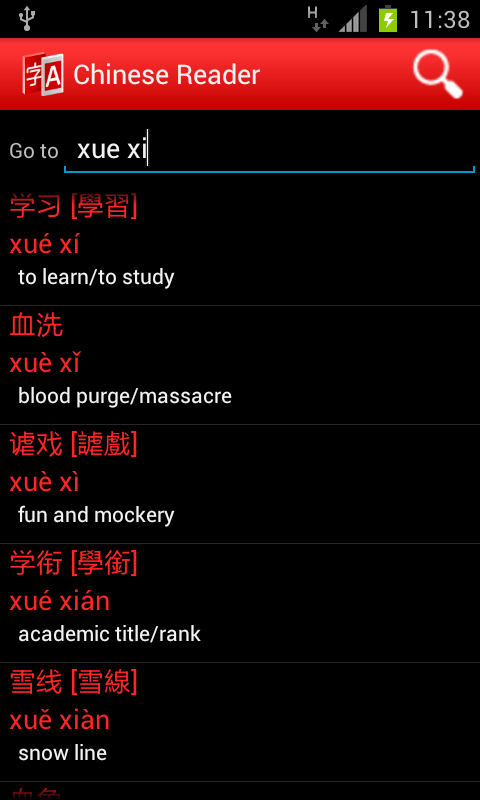 Almare Chinese Reader Free for Android version 1.0.You can use the Almare Chinese Reader Free to test the character recognition. Purchase the full version to see the translations of the recognized characters. In the free version you can also browse the dictionary using Pinyin romanization or search English words from translations.